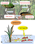 ![]() Figure 1 Positive interactions and complementary use of nitrogen (N) between rice and fish explain why the rice-fish coculture system maintains productivity for long time periods with low input of chemicals. (A) Positive interactions between rice and fish: Fish remove pests from rice through feeding activity, while rice plants moderate the field environment for fish, which in turn promotes fish activity and pest removal. (B) Complementary use of N by rice and fish: Unused fertilizer N promotes plankton in paddy fields that is consumed by fish. The unconsumed fish feed acts as an organic fertilizer, with the N in the unconsumed feed being gradually used by the rice. Thus, rice and fish use different forms of N, resulting in a high efficiency of N utilization in RF (Adopted from Xie et al., 2011) |