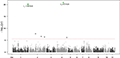![]() Figure 1 Manhattan plot showing significant SNPs associated with DTF. SNPs are labeled with the SNP name. SNPs in green are discussed further in the text. Trait-SNP associations were performed using FarmCPU in GAPIT. The horizontal dotted red line represents the Bonferroni correction as p = 0.05 (Adopted from Chiteri et al., 2024) |