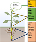 Figure 2 Gene families involved in translocation and accumulation of Fe2+/Zn2+ in seed of common bean. YSL1 and YSL3 genes are involved in unloading minerals to seeds. YSL, Yellow Stripe Like; OPT, Oligopeptide transporter; NRAMP, Natural resistance-associated macrophage protein; IRT, Iron regulated transporter; FER, Ferritin; FRO Ferric reduction oxidase; ZIP, Zinc induced protein; HA, H+ transporting ATPase; GLP, Germin like protein. Plant images made with Biorender (https://biorender.com/) (Adopted from Jha et al., 2022) |
