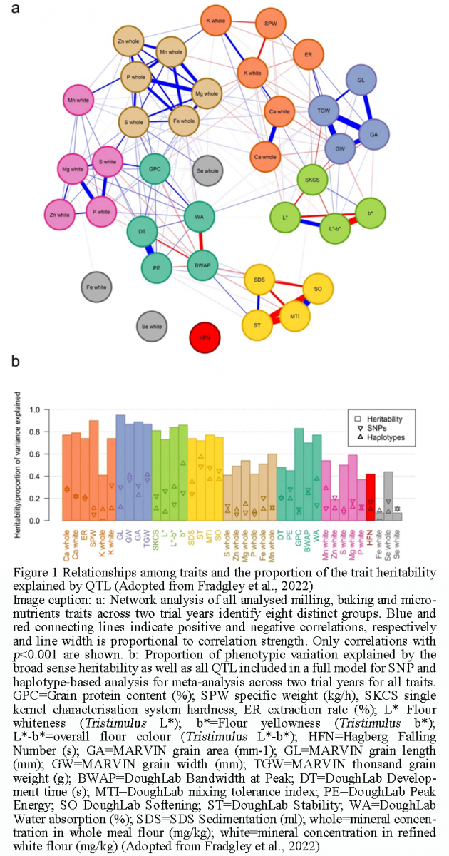 Image caption: a: Network analysis of all analysed milling, baking and micronutrients traits across two trial years identify eight distinct groups. Blue and red connecting lines indicate positive and negative correlations, respectively and line width is proportional to correlation strength. Only correlations with p < 0.001 are shown. b: Proportion of phenotypic variation explained by the broad sense heritability as well as all QTL included in a full model for SNP and haplotype-based analysis for meta-analysis across two trial years for all traits. GPC=Grain protein content (%); SPW specific weight (kg hl-1), SKCS single kernel characterisation system hardness, ER extraction rate (%); L*=Flour whiteness (Tristimulus L*); b*=Flour yellowness (Tristimulus b*); L*-b*=overall flour colour (Tristimulus L*-b*); HFN=Hagberg Falling Number (s); GA=MARVIN grain area (mm-1); GL=MARVIN grain length (mm); GW=MARVIN grain width (mm); TGW=MARVIN thousand grain weight (g); BWAP=DoughLab Bandwidth at Peak; DT=DoughLab Development time (s); MTI=DoughLab mixing tolerance index; PE=DoughLab Peak Energy; SO DoughLab Softening; ST=DoughLab Stability; WA=DoughLab Water absorption (%); SDS=SDS Sedimentation (ml); whole=mineral concentration in whole meal flour (mg/kg); white=mineral concentration in refined white flour (mg/kg) (Adopted from Fradgley et al., 2022)